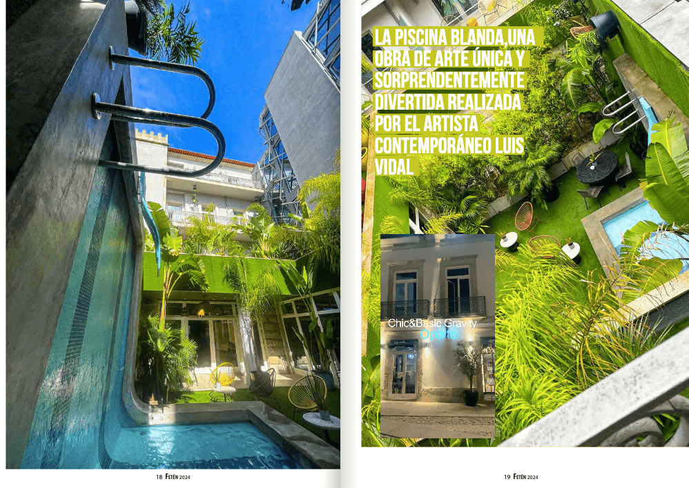 Continuamos avanzando por este mundo al que parece que hemos accedido traspasando el espejo como Alicia y encontramos algo mucho más asombroso aún: La piscina blanda, una obra de arte única y sorprendentemente divertida realizada por el artista contemporáneo Luis Vidal, director creativo de la marca. En un patio interior, en una de sus paredes trepa una piscina a la que no le falta ni trampolín, ni escaleras.
