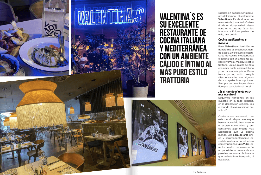 Pero Valentina's también se transforma al anochecer, dando paso a un excelente restaurante de cocina mediterránea e italiana con un ambiente cálido e íntimo al más puro estilo trattoria. En sus platos se nota ese amor por la cocina italiana y por la materia prima. Pasta fresca, pizzas, risotto o exquisitas ensaladas son algunas de sus apetecibles opciones. Siempre con ese toque divertido que caracteriza al hotel.
