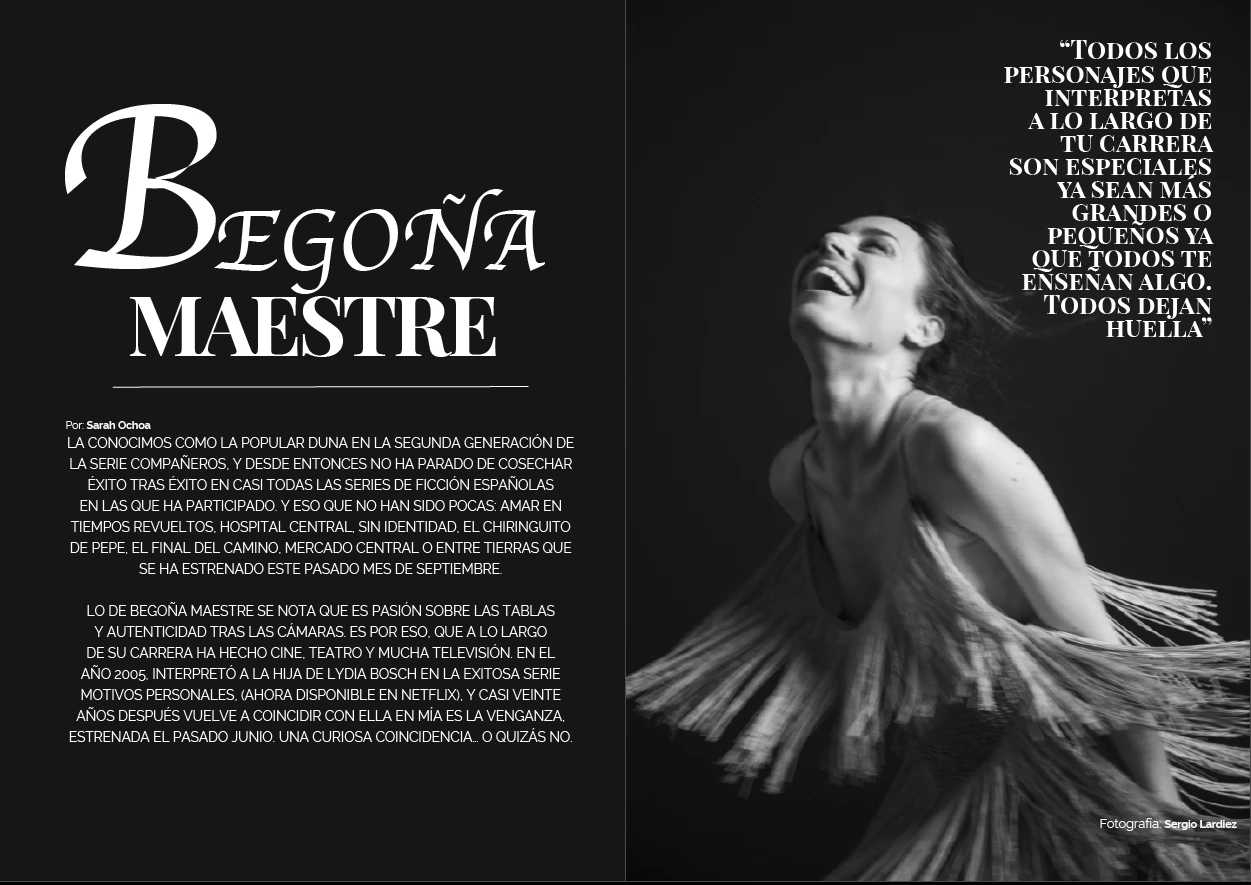 Begoña Maestre: Es cierto que todos los personajes que interpretas en tu carrera son especiales, ya sean grandes o pequeños, ya que todos te enseñan algo. Esta profesión es maravillosa, entre otras cosas, porque te permite ponerte en los zapatos de otra persona y ver la vida desde un ángulo diferente. Eso te enriquece y te hace más humano y compasivo. Por eso es tan difícil elegir, ¡todos dejan huella!