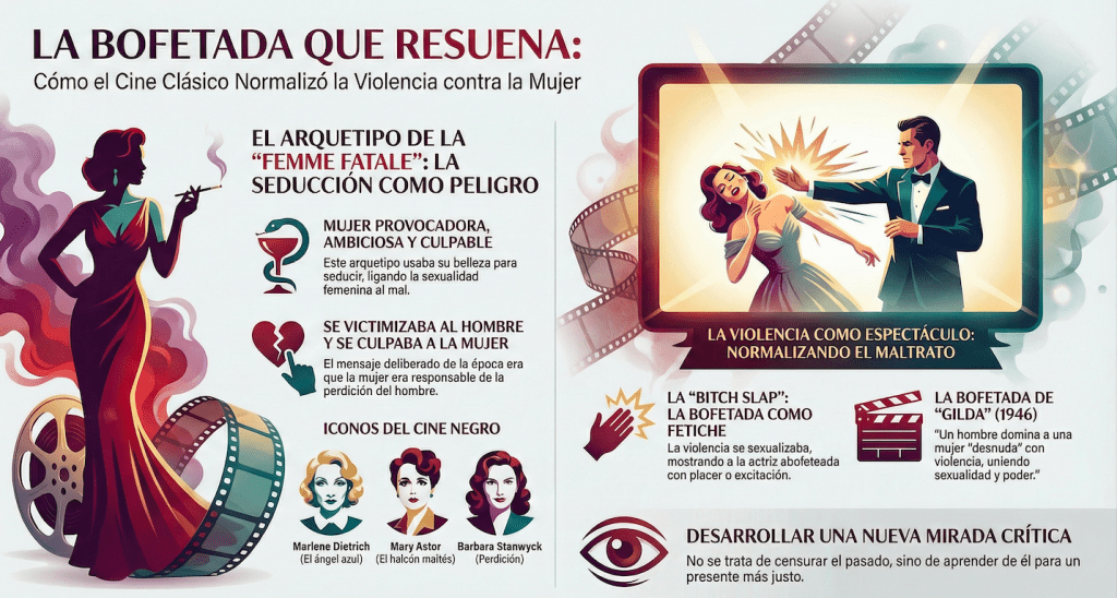 Las bofetadas a las mujeres perpetuaban la imagen del macho dominante frente a la mujer sumisa. Y en muchas ocasiones la respuesta de la actriz abofeteada —siguiendo instrucciones del director— mostraba placer o incluso excitación sexual. De hecho, se creó un término tristemente revelador: la bitch slap, la bofetada a la zorra.