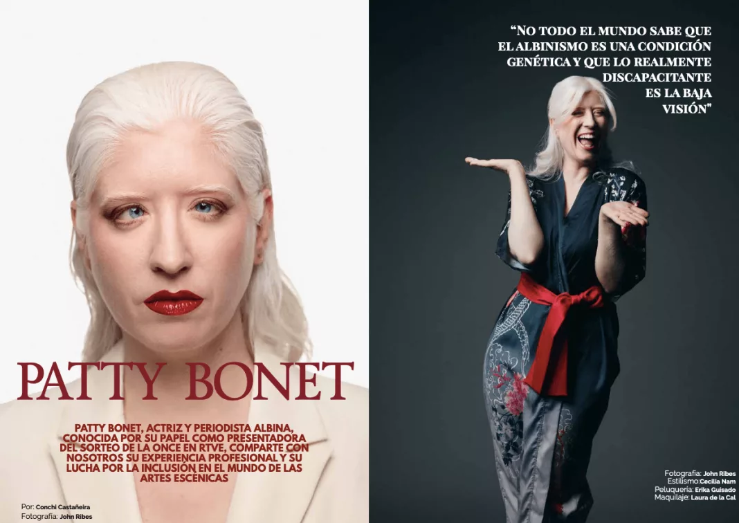 Patty Bonet, actriz y periodista albina, conocida por su papel como presentadora del sorteo de la ONCE en RTVE, comparte con nosotros su experiencia profesional y su lucha por la inclusión en el mundo de las artes escénicas.