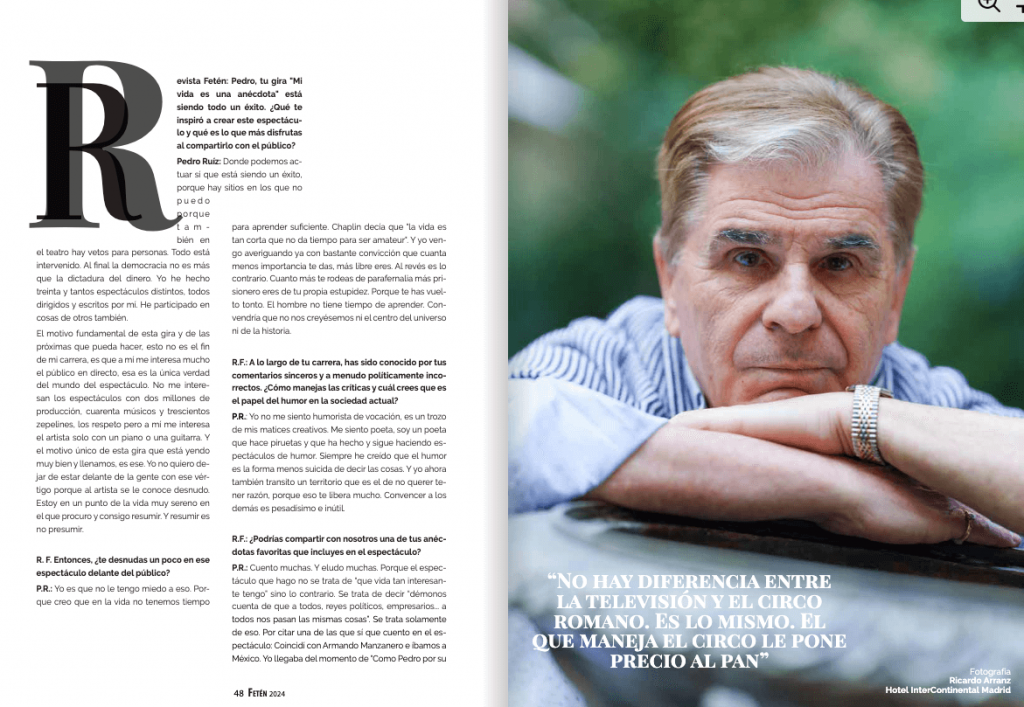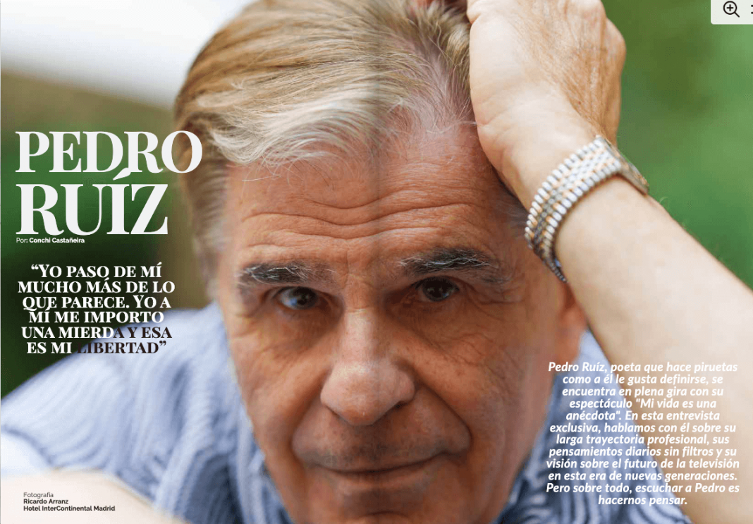 Pedro Ruiz, poeta que hace piruetas como a él le gusta definirse, se encuentra en plena gira con su espectáculo “Mi vida es una anécdota”. En esta entrevista exclusiva, hablamos con él sobre su larga trayectoria profesional, sus pensamientos diarios sin filtros y su visión sobre el futuro de la televisión en esta era de nuevas generaciones. Pero sobre todo, escuchar a Pedro es hacernos pensar.