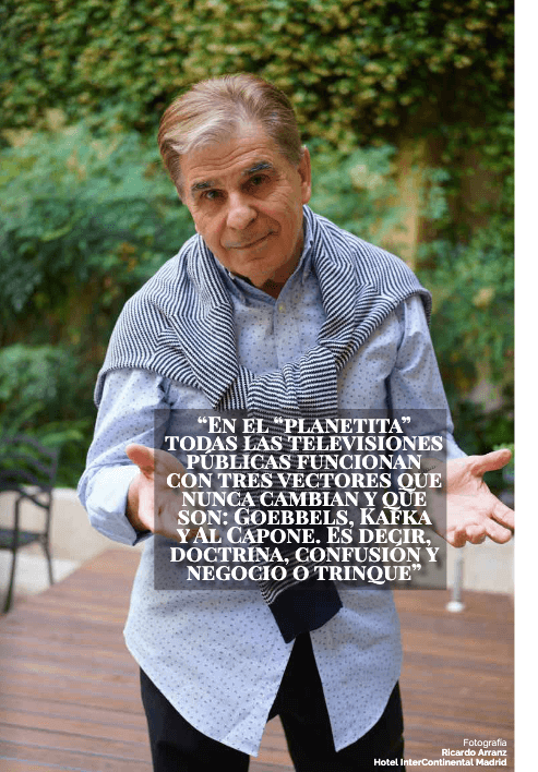 P.R.: Yo lo matizaría. He estado doce años prohibido en tiempo de Franco; he hecho dos pequeñas temporadas de “Como Pedro por su casa”, siete programas de diez; he estado nueve años sin trabajar en tiempo de Felipe González. Y ahora llevo veinticinco sin poder acceder a la televisión a trabajar. He hecho un programa este pasado diciembre, una oportunidad única y no soy un habitual, porque las televisiones públicas son las que me interesan, las privadas manejan demasiado deterioro. En el “planetita” todas las televisiones públicas funcionan con tres vectores que nunca cambian y que son: Goebbels, Kafka y Al Capone. Es decir, doctrina, confusión y negocio o trinque. Si no estás en uno de esos clubes eres un sospechoso. Y no lo digo denunciando, yo lo tengo muy asumido. De vez en cuando te permiten aparecer en el escaparate pero eres sospechoso. Si uno quiere ser personaje fijo en las televisiones públicas debe aprender dos frases. La primera es: “Sí señor” y la segunda es: “¿Con quién hay que repartir?”
