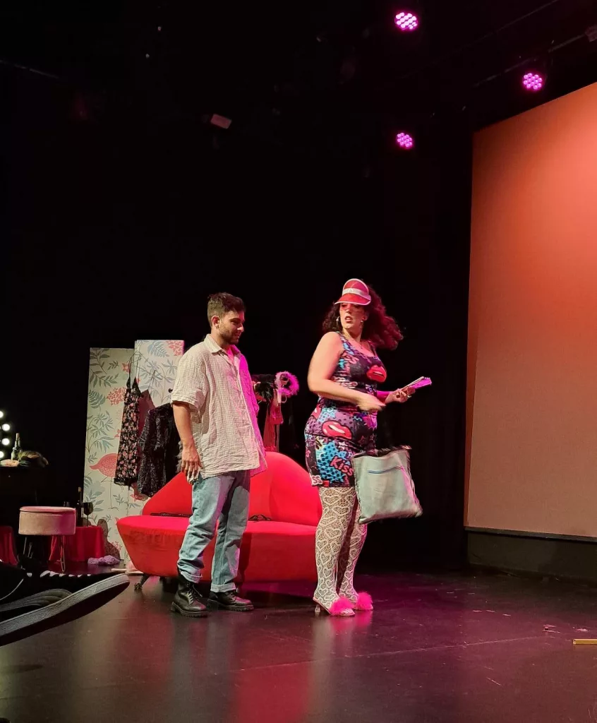 Una voz en off nos transporta al Madrid de los años 90, al camerino de una bailarina erótica, Chonchi Star (María Córdoba), la estrella de “La pasiones”, el bar de alterne más conocido de Madrid. Al comenzar la función nos colamos en la intimidad de una llamada telefónica que Chonchi está teniendo con Pepe, su jefe, minutos antes de salir a actuar. Solo escuchamos las respuestas de ella, que logran, por su espontaneidad y excentricidad, atrapar desde el primer minuto a un público que se muestra curioso y que no puede evitar reír poco después. Ella está preocupada porque su partenaire la ha dejado tirada y Pepe ha contratado a un nuevo bailarín, Antonio (Adrián Reyes), completamente inexperimentado pero famoso en su pueblo por sus “atributos”. La timidez y el retraimiento de este contrastan con la naturalidad sin filtros de Chonchi, que trata de espabilarle lo antes posible antes de salir a bailar. Las risas se mezclan entre el diálogo de ambos y llenan los silencios.