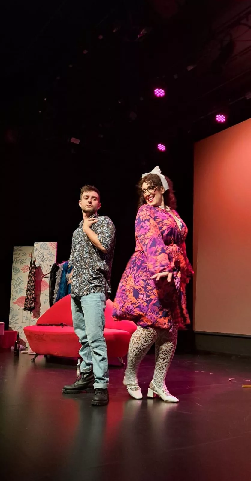 Poco después, con el cambio de luces, potenciando el color rojo, nos transportamos a su show nocturno. Los dos actores consiguen llenar por completo el escenario, causando sonrisas, miradas de admiración y, sobre todo, risas, muchas risas.