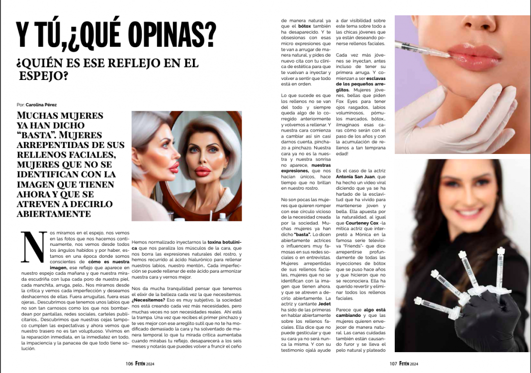 No son pocas las mujeres que quieren romper con ese círculo vicioso de la necesidad creada por la sociedad. Muchas ya han dicho “basta”. Lo dicen abiertamente actrices o influencers muy famosas en sus redes o entrevistas. Mujeres arrepentidas de sus rellenos faciales, mujeres que no se identifican con la imagen que tienen ahora y que se atreven a decirlo abiertamente.