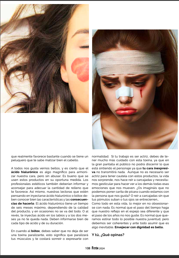 Hemos normalizado inyectarnos toxina botulínica, que nos paraliza los músculos de la cara, que nos borra las expresiones naturales del rostro, y hemos recurrido al ácido hialurónico para rellenar nuestros labios, nuestro mentón. Cada imperfección se puede rellenar de este ácido para armonizar nuestra cara y vernos mejor.